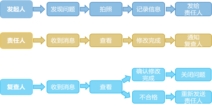 质量员(安全员)在日常工作中,通过手机端直接拍照记录质量问题(安全隐患),系统自动推送给相关整改人。整改人对相关隐患进行整改,并将结果上传至。系统自动推送给检查人进行复查。检查人对现场隐患进行复查,复查合格后将复查结果拍照上传至系统,工作闭合。当复查不合格时,可再次将整改任务推送给责任人去整改。