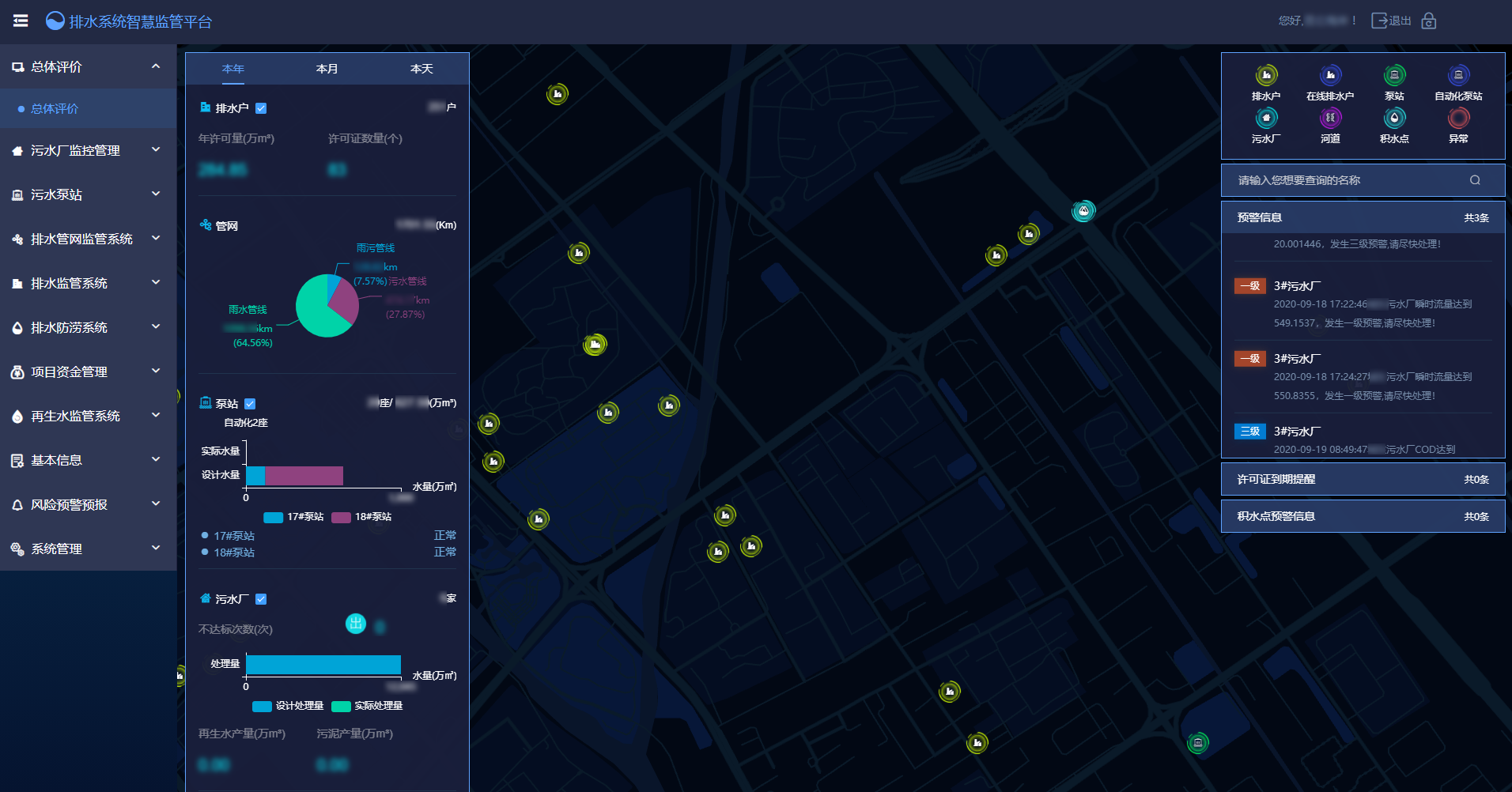 项目围绕盐城市区大排水监管业务需求,整合排水户、管网、泵站、污水处理厂、排水口、积水点的基础信息、监测数据、视频影像,为用户构建完整排水系统运行数字画像,辅助决策,全面提升对城市排水系统的智能管控与分析,实现“实时感知、准确把握、高效运筹”的“智慧排水”目标。
