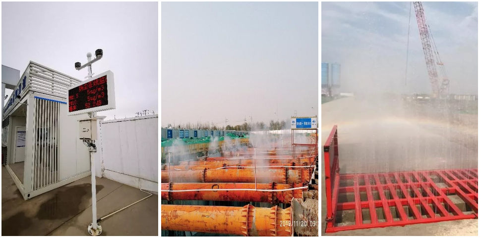智能水雾喷淋系统:通过扬尘监测设备实时对现场作业环境监测,系统自动对数据进行分析,如果现场扬尘超过设定值,喷淋系统自动打开,对现场进行降尘。