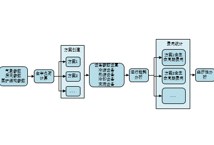 模型创建导入,设置气象参数、房间参数、围护结构参数后,先进行全年负荷计算,然后创建不同的空调方案,并定义各个方案详细的设备参数和运行信息,进行能耗分析,最后统计不同方案的运行费用和初投资费用,进行经济性分析对比,确定最优方案