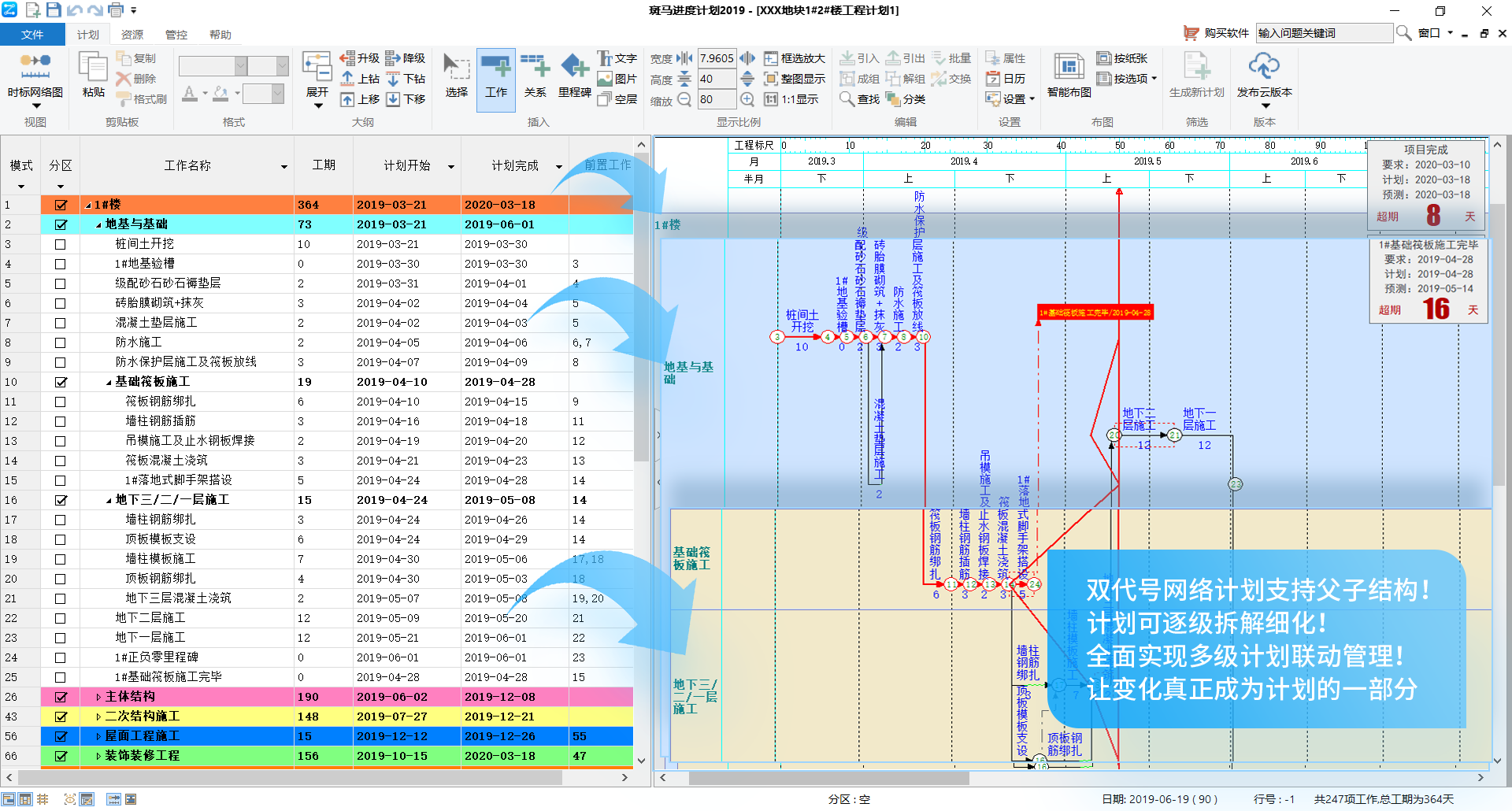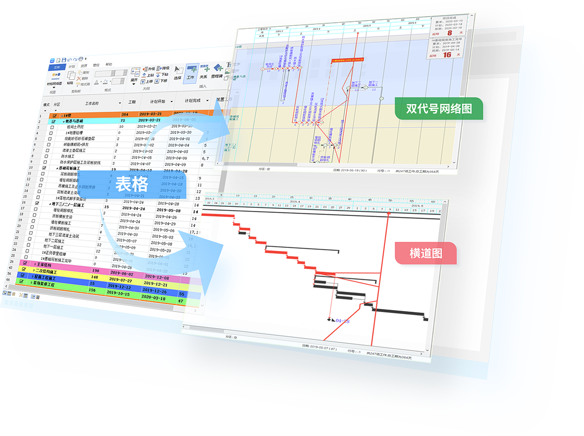 导入Project、Excel计划,横道图秒变双代号网络图!计划质量更高!将Project、Excel编制的计划导入到斑马进度计划软件中,可以自动生成双代号网络图,直观发现Project计划的逻辑关系错漏问题,检查关键路径和工期是否正确,为编制高质量进度计划保驾护航! 辅助项目提前规避越到后期发现越干不完、无效抢工等风险! 项目可控,从计划源头抓起! |
