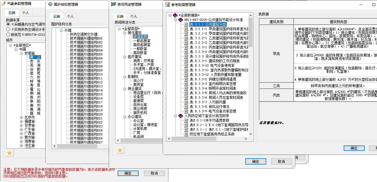 各种公用数据管理器气象参数管理器中增加了新版手册中的气象参数数据;围护结构管理器收录了1000多种常用的围护结构做法;房间用途管理中收录了近50种不同房间用途的设计参数供用户选择;参考数据管理器中收录了负荷计算过程需要查询的各种表格数据(来源于各种权威参考资料)。 |