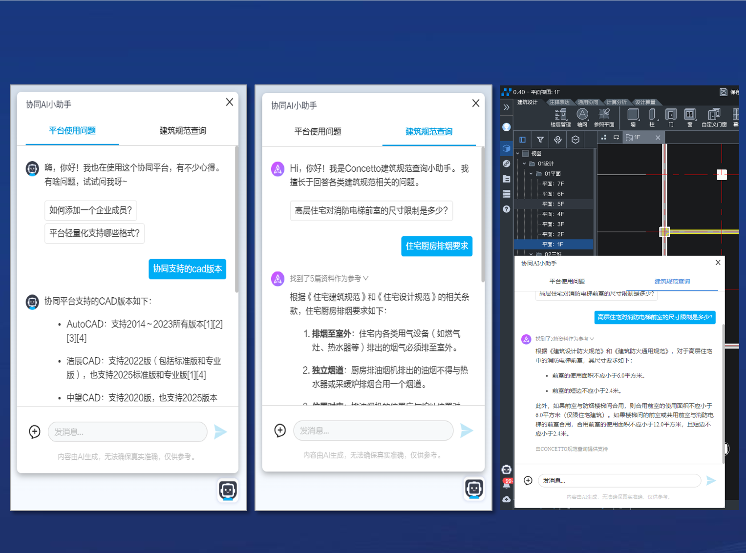 接入AI,平台AI小助手支持回复平台使用问题和查询建筑规范