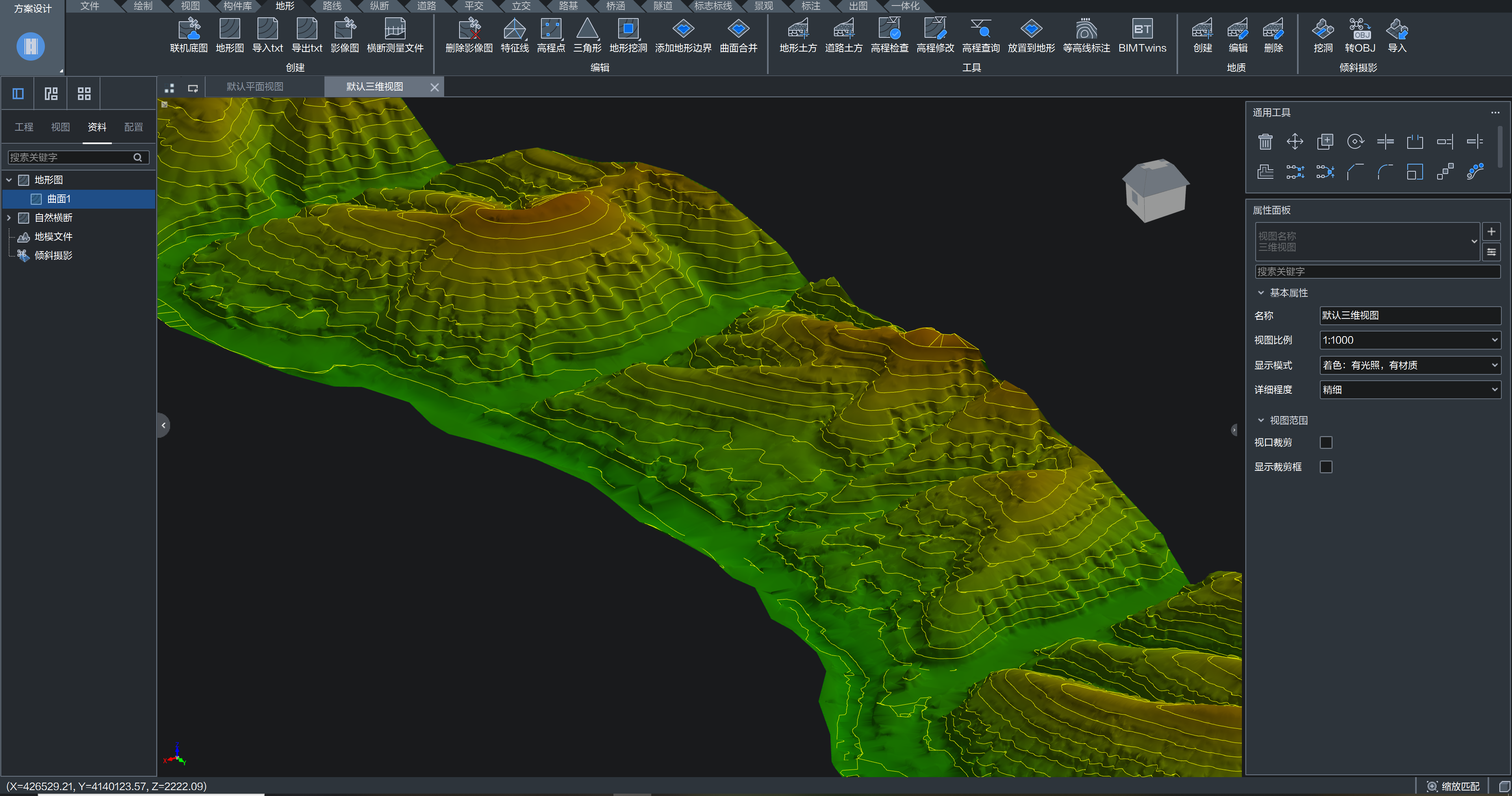 地形设计地形功能支持联机底图、地形图、横断测量文件等生成地形图,支持地形数据的检查修改 支持基于地形曲面的高程数据进行高程分析以更直观地表现地形高程变化情况 支持倾斜摄影模型动态加载及浏览 支持通过地质钻孔资料生成地质模型 |