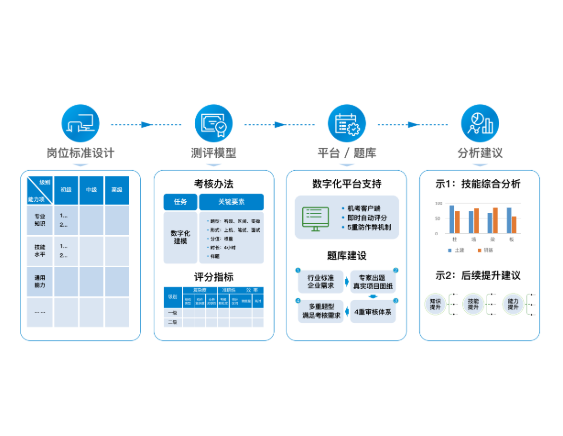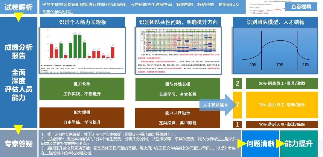 企业人才测评核心价值点1-企业:准确识别员工的专业技能水平,为企业在人才选、训、育、留上提供客观、精准的参考依据,赋能企业组织管理和人才培养的效率及质量。 2-个人:提升行业从业者能力,激发潜力增强自信,拓展职业通道。 |