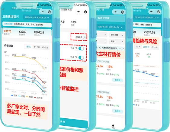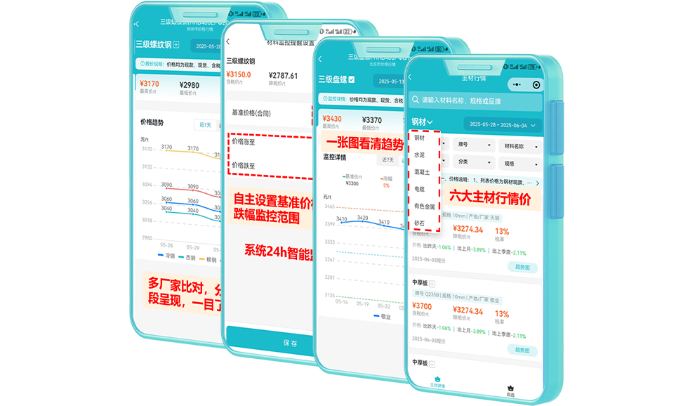 • 解决⼤宗主材⾏情盯不住的问题:随时掌握价格波动信息、科学决策采购时机 • 解决设备、装修材料询价难的问题: 1分钟找到材料⼚家、不打电话也能完成询价 • 提供全⽅位的材料价格管理服务 ,助⼒项⽬成本控制