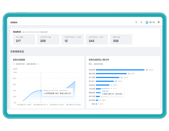 • 提供多维度的学习效果评估 • 为管理者制定员⼯学习发展策略提供数据⽀撑 • 让学习效果可视化、可量化、可追踪 • 帮助企业精准评估⼈才培养成效