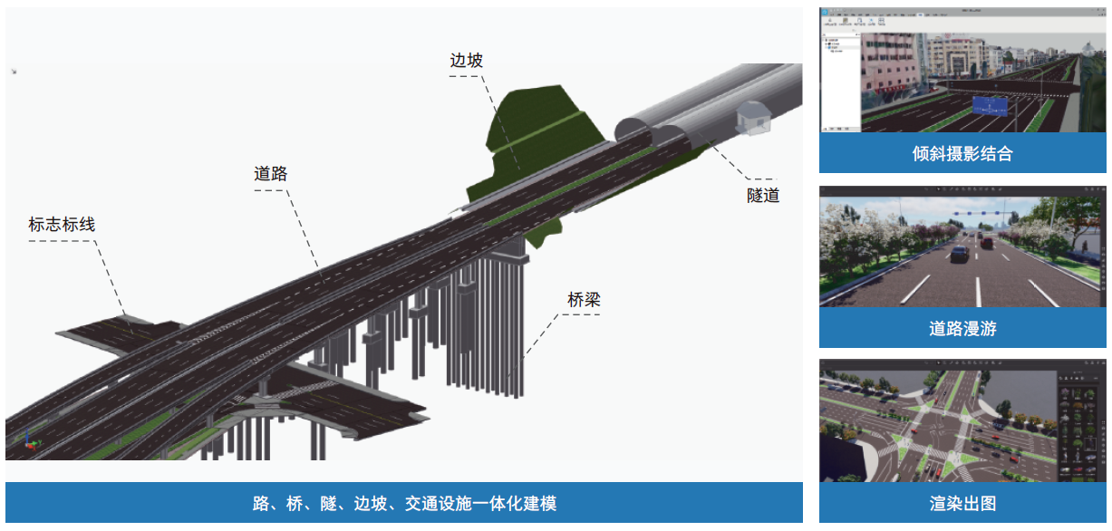 raybet雷竞技数维道路方案设计,通过BIM数据库直接驱动设计成果的生成。不改变既有的设计习惯,通过简单高效的方式完成设计建模。一个软件就可以实现倾斜摄影、联机地图、地形地质、道路、桥梁、隧道、涵洞、交通设施、景观、管线以及第三方软件所创建的地上地下建模与集成。同时软件内置渲染器,一键完成高画质高逼真渲染,可进行漫游视频制作导出,一款软件可完成多款软件工作,在提高效率的同时,避免因数据传递导致模型丢失。
